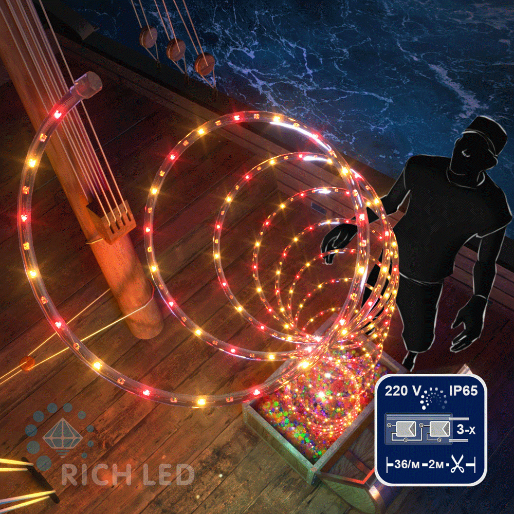 Отзывы о Светодиодный дюралайт, 3-х проводной, зеленый, кратность резки 2 метра, диаметр 13 мм, 220 В, 100 м Rich LED RL-DL-3W-100-240-G